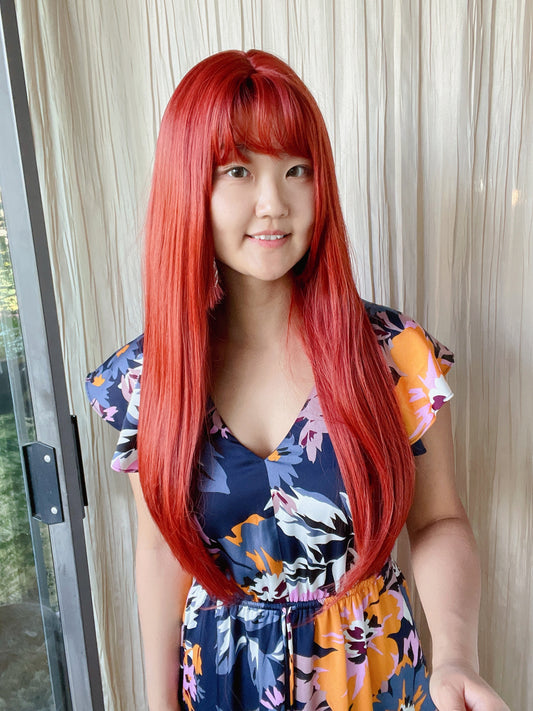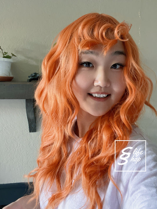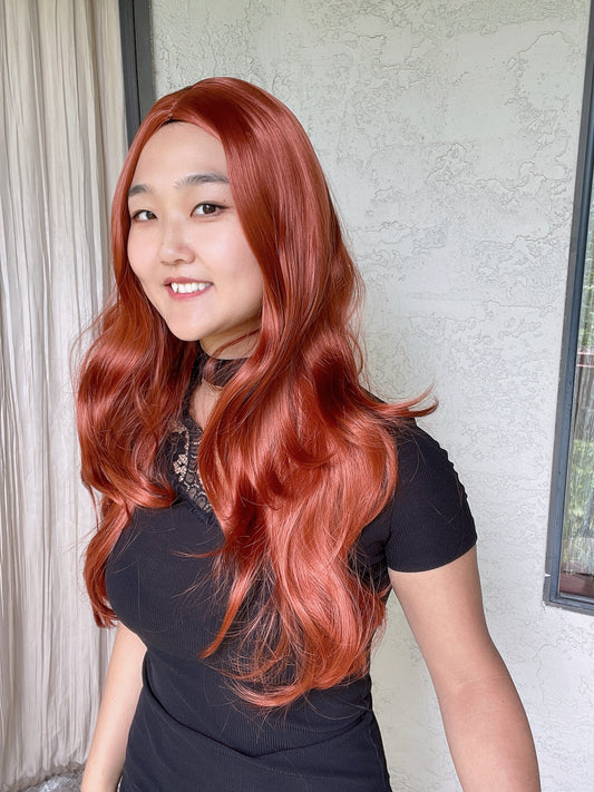 Beautiful long Wavy Curly Red Orange Wig Wine Burgundy Natural Realistic mid-part no bang