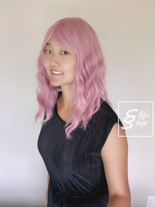 Beautiful Realistic Mid Length Short Wavy Pink Wig Natural Cute