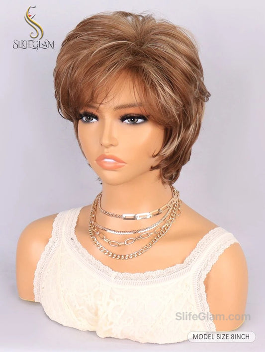 Realistic Short Pixie Cut Brown Wig with Blonde High Lights