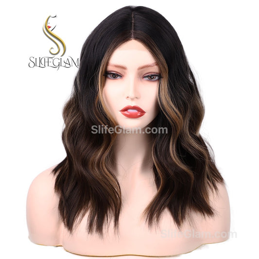 Realistic Wavy Black with Brown Highlights Shoulder Length Lace Front Wig Natural Realistic T-Part Mid-Part