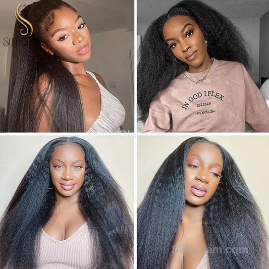SlifeGLAM Kinky Human Hair Wig Black Human Hair Wig Wavy Curly Pre PluckedMiddle Part Lace Wigs Long Lace Front Side Part Mid Part