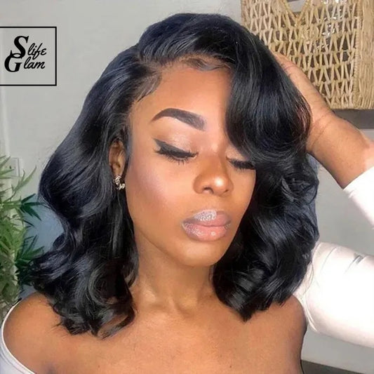 SlifeGLAM Short Bob Human Hair Wig Black Human Hair Wigs Pre Plucked Body Wave Middle Part Lace Wigs 8-16inch T Part Lace Front Side Part Mid Part 7A